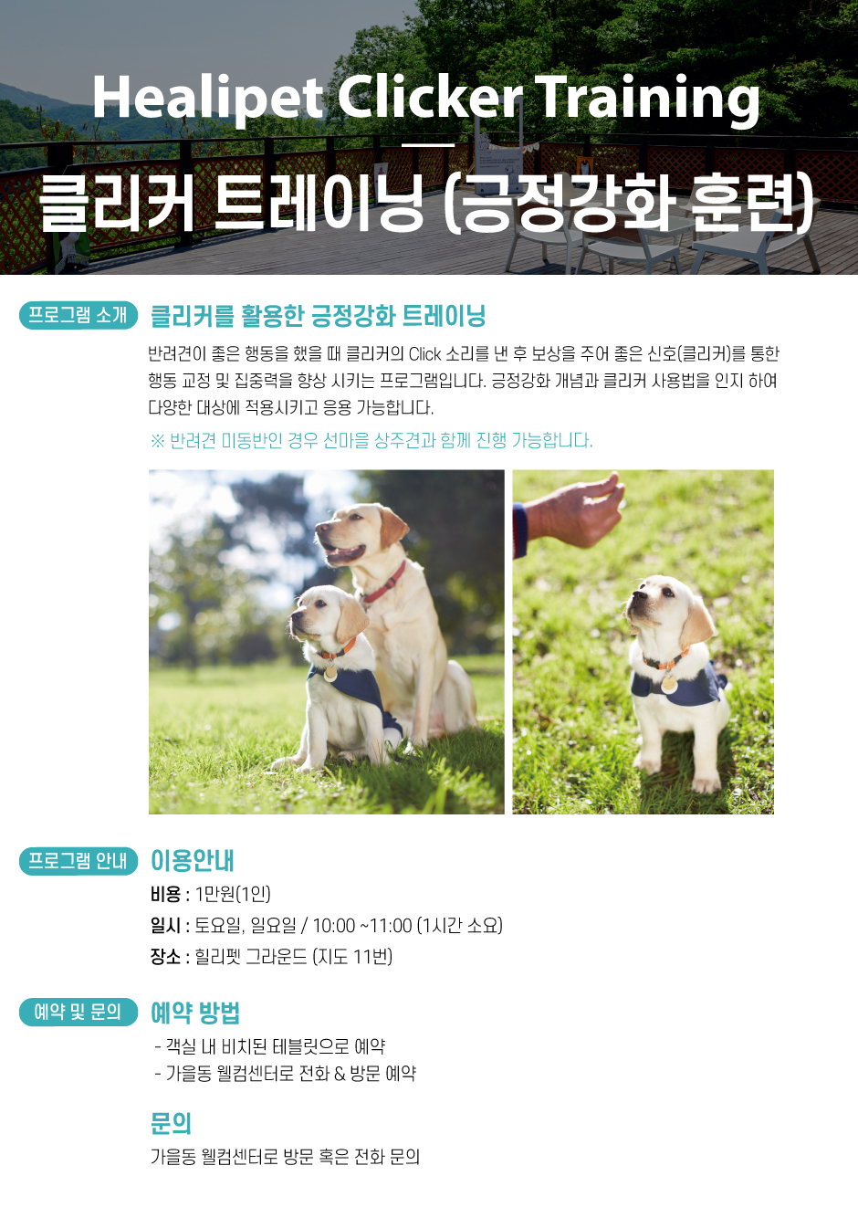 힐리펫 프로그램 일정은 변동될 수 있습니다. 힐리펫 일정표 확인 후 예약 바랍니다.